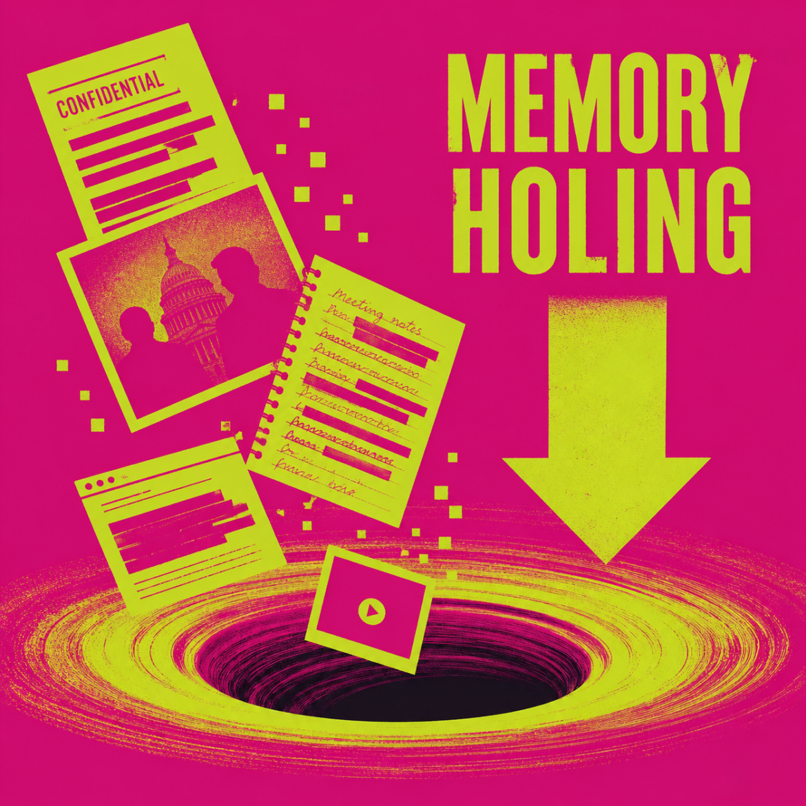 The deliberate, convenient erasure or disappearance of inconvenient facts, statements, history, or promises so that they no longer exist in the official record — or in people’s active awareness.