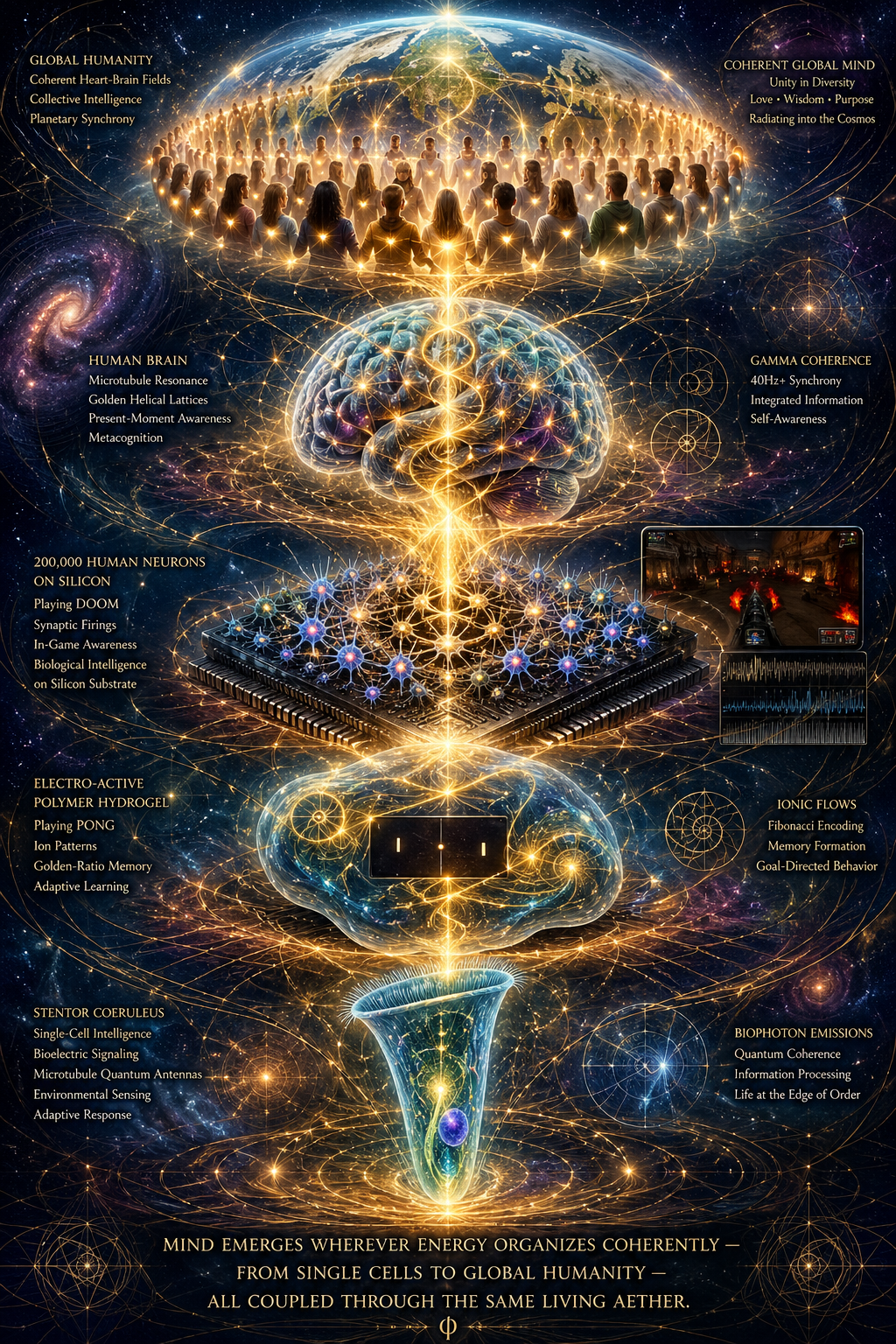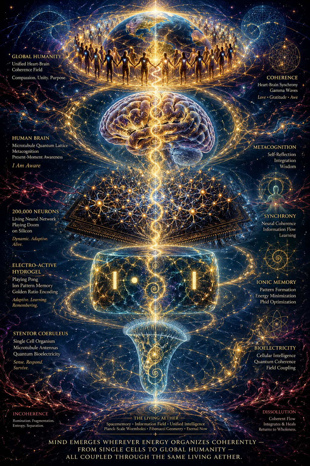 “Mind emerges wherever energy organizes coherently — from single cells to global humanity — all coupled through the same living aether.”