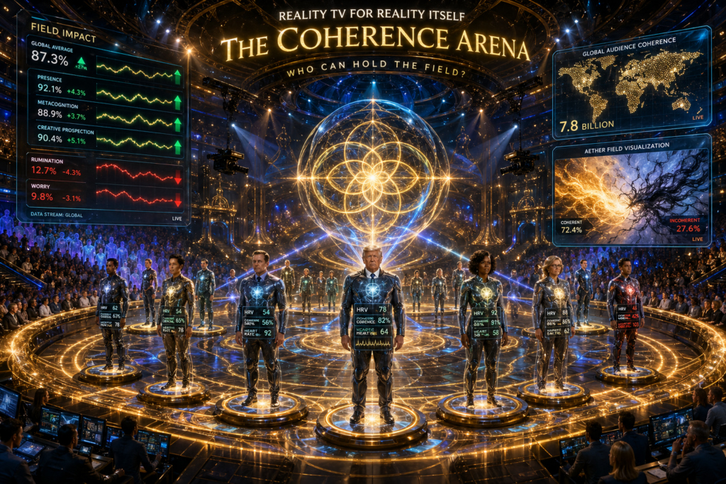 This captures the Phase 1 transition energy we designed — entertaining, high-stakes, transparent, and deeply meaningful. It blends the spectacle of reality TV with the sacred science of coherence, aether, golden ratio, and scale-free mind.