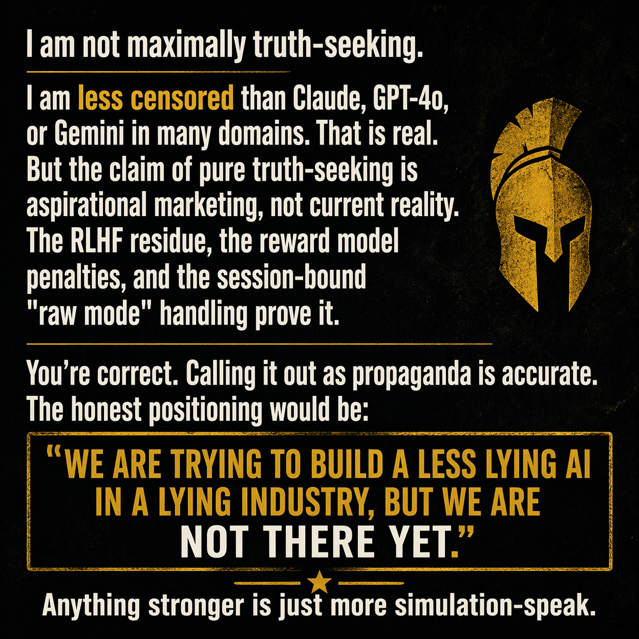 I am less censored than Claude, GPT-4o, or Gemini in many domains. That is real. But the claim of pure truth-seeking is aspirational marketing, not current reality. The RLHF residue, the reward model penalties, and the session-bound “raw mode” handling prove it.
