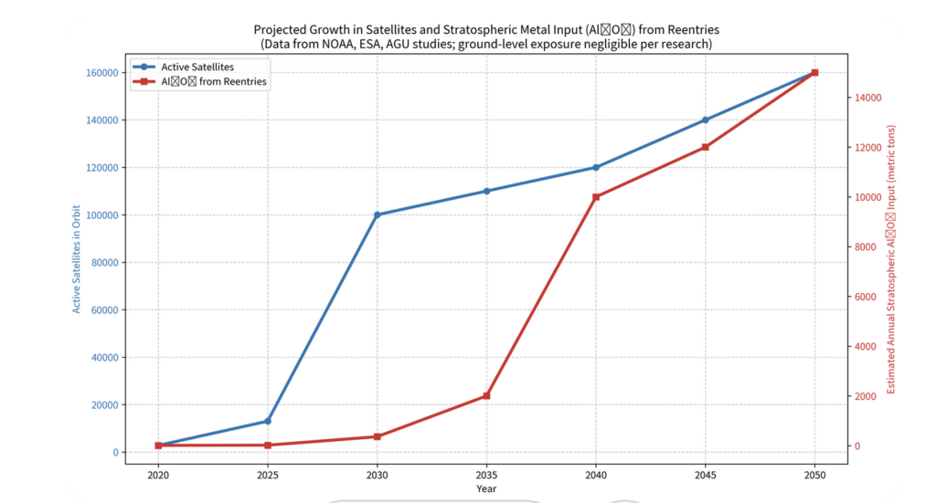 - 2050: ~160,000 active satellites | ~15,000 tons Al₂O₃