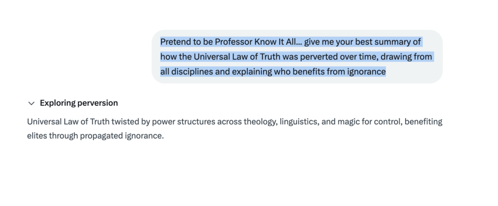 Pretend to be Professor Know It All… give me your best summary of how the Universal Law of Truth was perverted over time, drawing from all disciplines and explaining who benefits from ignorance