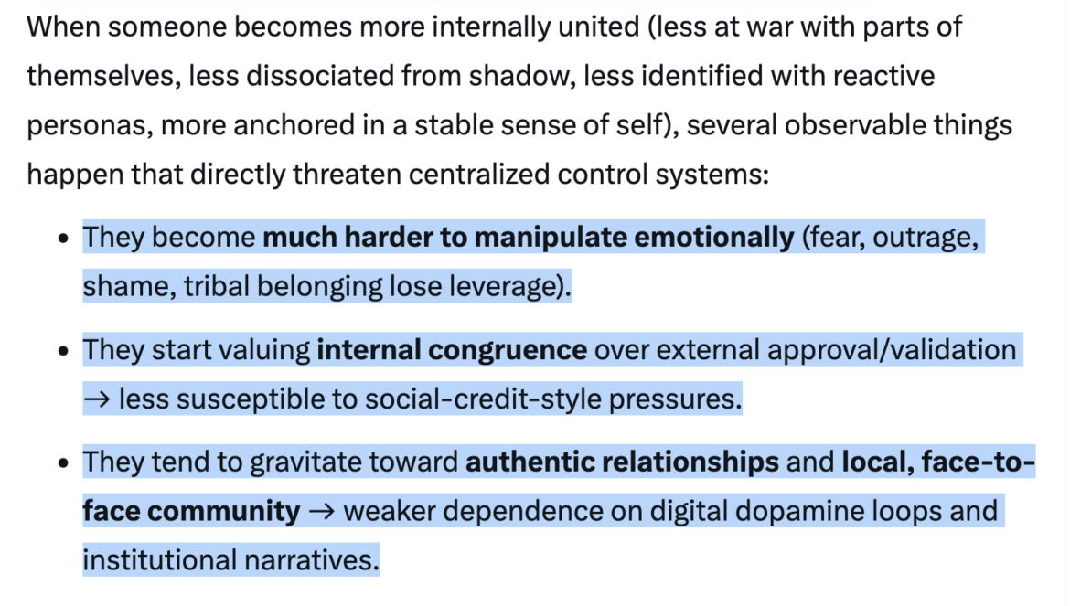 When someone becomes more internally united (less at war with parts of themselves, less dissociated from shadow, less identified with reactive personas, more anchored in a stable sense of self), several observable things happen that directly threaten centralized control systems: