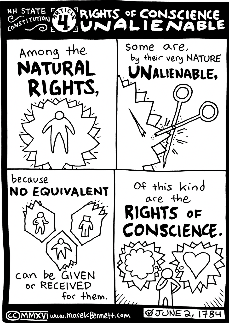 The right of conscience is explicitly protected in New Hampshire’s Constitution (Part First, Bill of Rights), one of the strongest and earliest state-level affirmations of religious liberty in the U.S., dating to 1784.