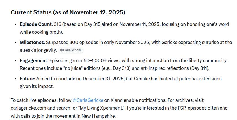 To catch live episodes, follow @CarlaGericke on X and enable notifications. For archives, visit carlagericke.com and search for “My Living Xperiment.” If you’re interested in the FSP, episodes often end with calls to join the movement in New Hampshire.