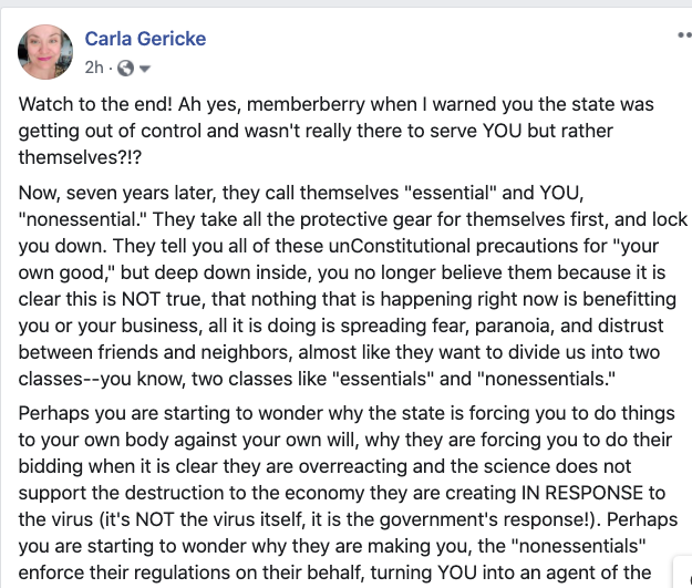 Now, seven years later, they call themselves “essential” and YOU, “nonessential.” They take all the protective gear for themselves first, and lock you down. They tell you all of these unConstitutional precautions for “your own good,” but deep down inside, you no longer believe them because it is clear this is NOT true, that nothing that is happening right now is benefitting you or your business, all it is doing is spreading fear, paranoia, and distrust between friends and neighbors, almost like they want to divide us into two classes–you know, two classes like “essentials” and “nonessentials.”