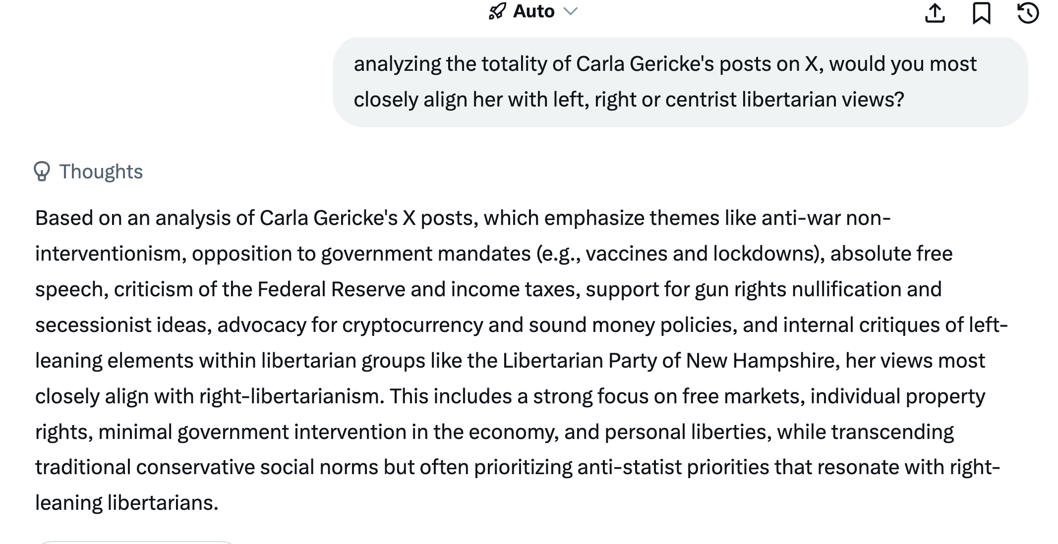 6 When you don't recognize yourself as a left-libertarian, declare yourself "the center," and yet boot right-libertarians while embracing the left… https://t.co/s1nOSkxGxq— Libertarian Party NH 🦔 (@LPNH) March 2, 2026 analyzing the totality of Carla Gericke’s posts on X, would you most closely align her with left, right, or centrist libertarian views? Then I asked live on the LPNH thread, and got this… @grok "analyzing the totality of Carla Gericke's posts on X, would you most closely align her with left, right, or centrist libertarian views?"— Carla Gericke, Live Free And Thrive! (@CarlaGericke) March 2, 2026 @grok what is the effect of chronic liars in building a high trust society? How best to deal with such misrepresentations and people?— Carla Gericke, Live Free And Thrive! (@CarlaGericke) March 2, 2026 I also challenged all LPNH followers to find the evidence that I am left or right leaning. Still waiting, because, of course, the people badmouthing me are lying. That’s their shtick. Insult, lie, misrepresent, destroy. For likes. Sad. 1ABad Characterfree state projectLibertarian PartyLibertarian vs. RepublicanLPLPNHThe Good Life 0 comments 0 FacebookTwitterPinterestEmail Carla Gericke previous post AI and I: It Is Time to Ask Who Is Lying to You About Me (And Why You Believe It) You may also like AI and I: It Is Time to Ask... 03/01/2026 AI and I: How Pro-Natal is the FSP?... 03/01/2026 AI and I: Can a Founder and President... 02/28/2026 AI and I: That Chef’s Kiss 02/23/2026 AI and I: When That False Flag Alien... 02/23/2026 AI and I: Hey, NH, Let’s Cherish Guns... 02/18/2026 What Doesn’t Kill You Makes You Stronger. And... 02/17/2026 AI and I: Psst… Irony Poisoning Is Quietly... 02/16/2026 AI and I: Grok Says This is How... 02/14/2026 AI and I: Are You Suffering From Full-Blown... 02/14/2026