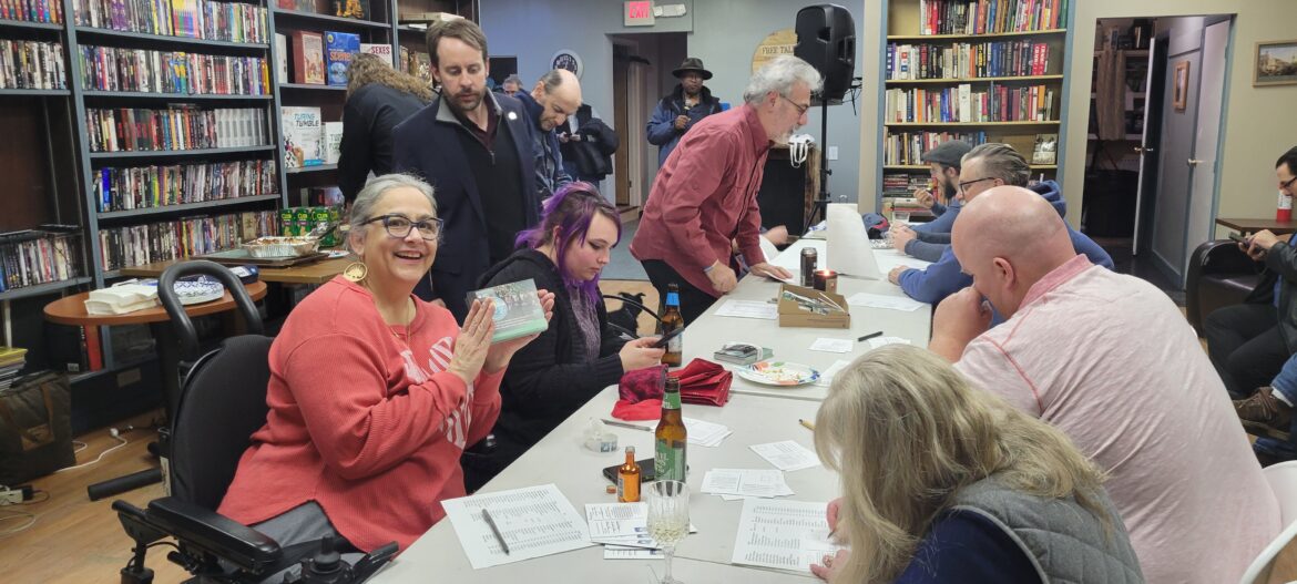 We doubled up the evening’s festivities–the theme was BRING WHAT YOU LOVE (I brought Louis)–with some FSP volunteer efforts… Addressing 150 postcards to remind Freestaters of the upcoming Liberty Forum in less than a month. Get your TIX TODAY. Many hands make light work!