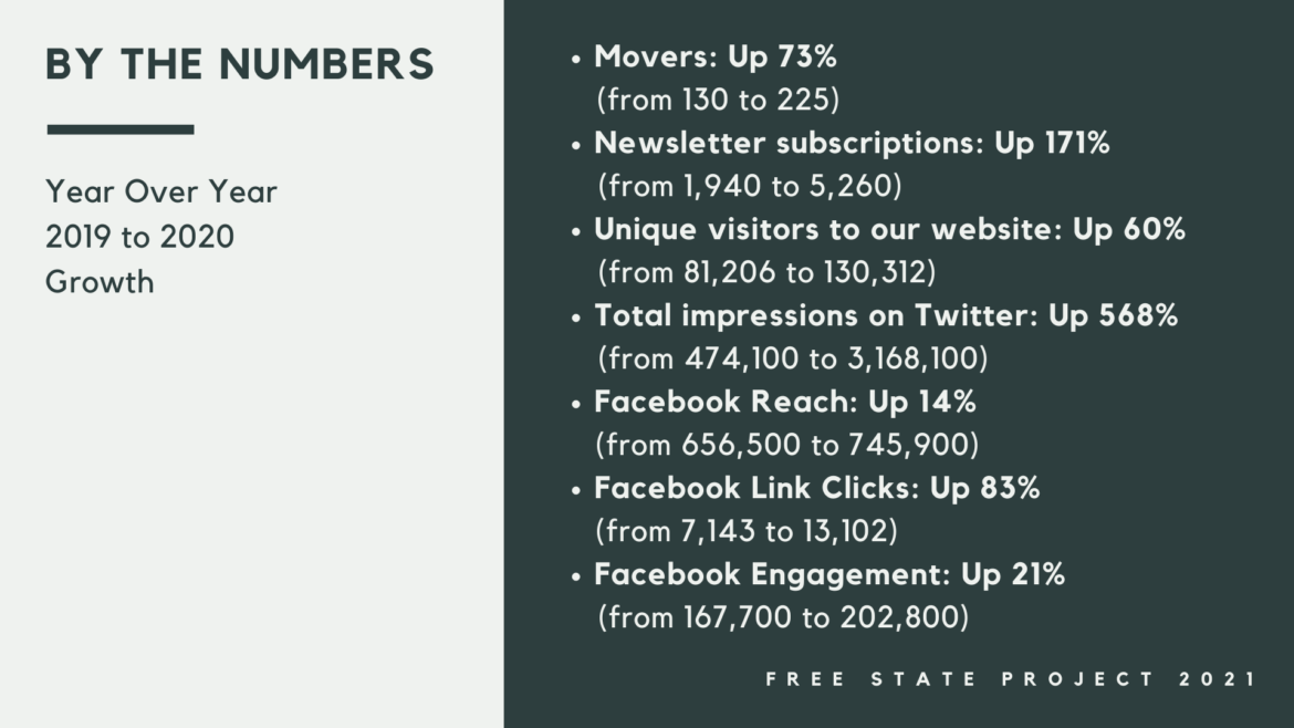 Come join the fun! Not ready to move quite yet, but curious? Come to the 18th Annual Porcupine Freedom Festival, aka PorcFest, taking place June 21-27, 2021 in the White Mountains. Join thousands of like-minded people for a weeklong celebration, with confirmed speakers like Tom Woods and Jeffrey Tucker. This year, we are putting ourselves front and center, and showcasing our incredible community of incredible free staters doing incredible things. Learn more at PorcFest.com. It’s going to be the greatest year ever, so don’t miss out! Get your ridic cheap $30 tickets TODAY because prices will go up! You also need to book your accommodation with Rogers, and sites are selling out. Don’t wait. This year is going to be BANANAS!!!