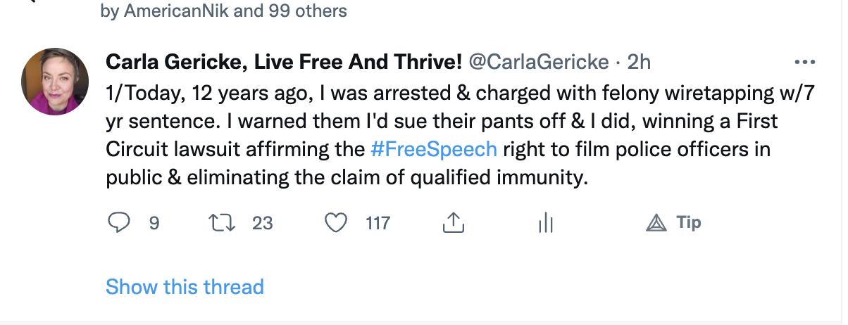 1/Today, 12 years ago, I was arrested & charged with felony wiretapping w/7 yr sentence. I warned them I'd sue their pants off & I did, winning a First Circuit lawsuit affirming the #FreeSpeech right to film police officers in public & eliminating the claim of qualified immunity.